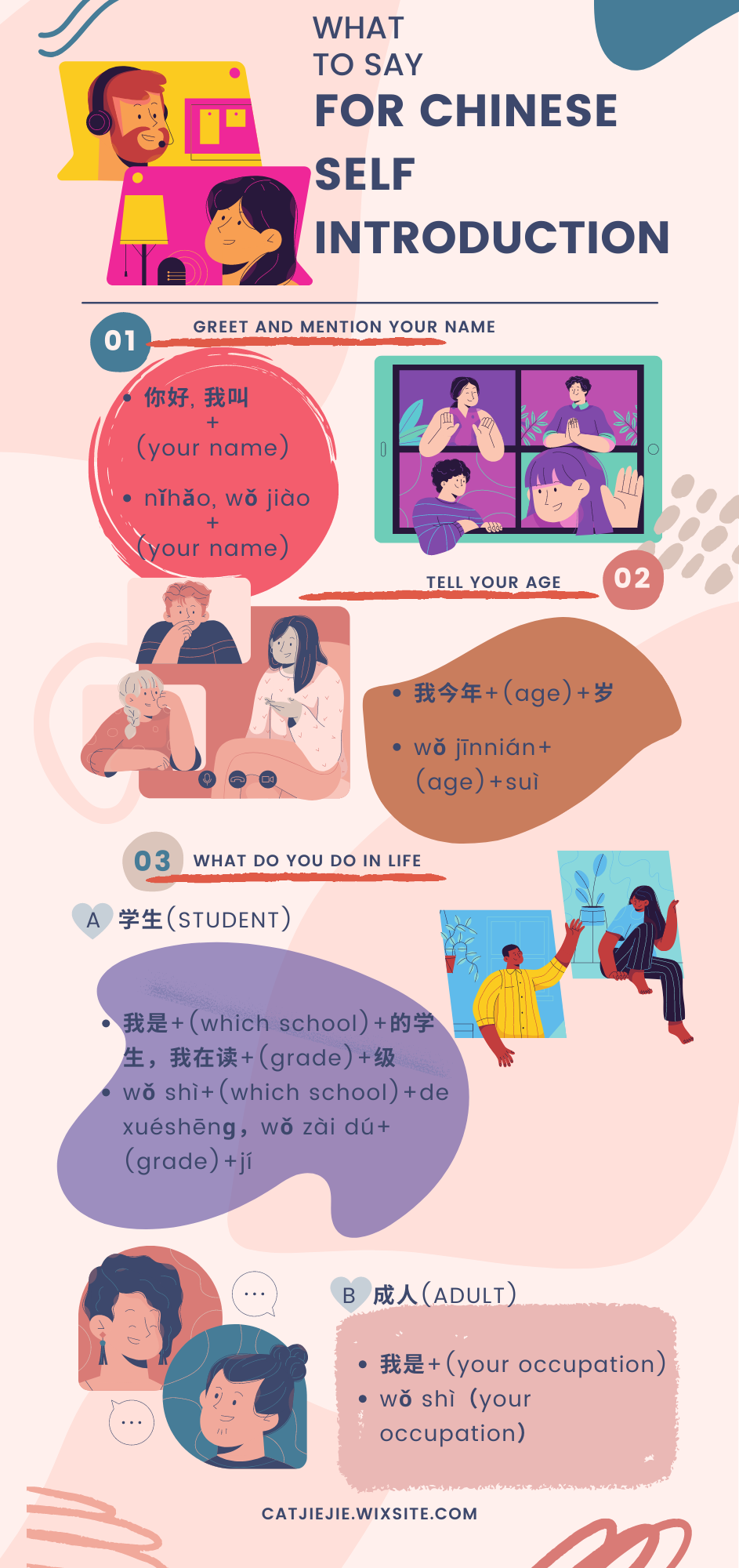 wǒ shì(which school)de xuéshēnɡ,wǒ zài dú(grade)jí (ii) 成人(adult): 我是+(your occupation)